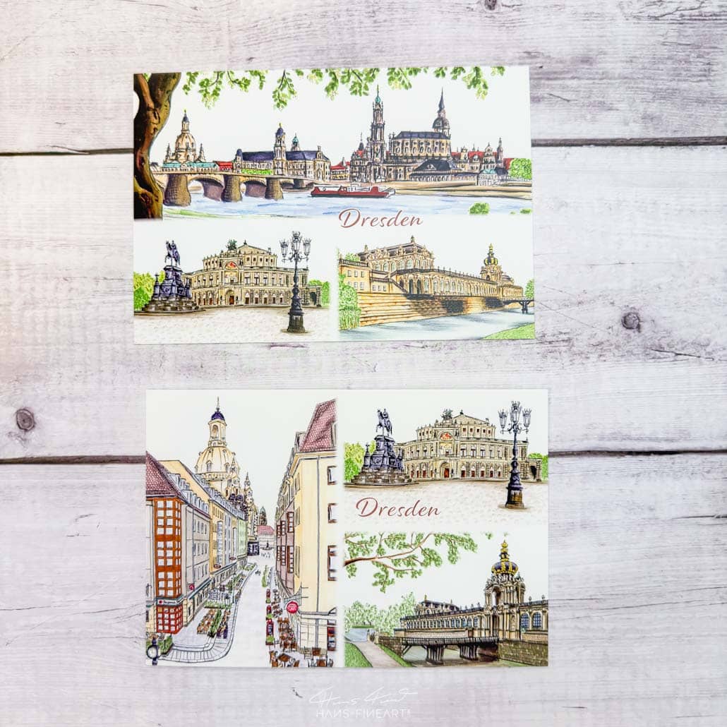 Dieses Geschenkset vereint unterschiedliche Formate und Motive aus meinem Dresden-Sortiment. Fotografie und Illustration treffen hier aufeinander und ergeben eine ausgewogene Mischung aus bekannten Stadtansichten und besonderen Details.